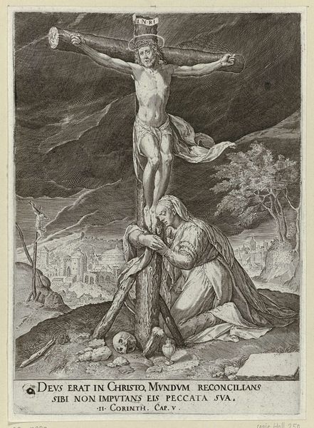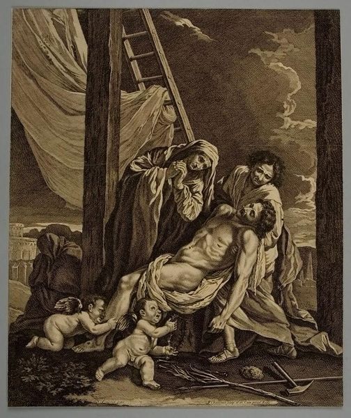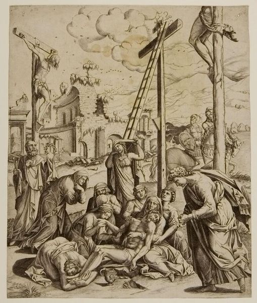 Curator: Seeing Aegidius Sadeler II's "Descent From the Cross," I immediately note the graphic intensity and the almost brutal depiction of Christ's body. Editor: Absolutely. There's a harshness to the etching process itself that amplifies the raw emotional pain. Look at the labor involved in the fine lines creating such dramatic lighting. Curator: Indeed. The ladders flanking the cross, usually just a means to an end, here symbolize the means to something much deeper—a bridge between earthly suffering and spiritual release. Editor: And yet, the very process of creating this image—the acid biting into the copperplate—mirrors the agony depicted. The materials themselves carry a symbolic weight of destruction and creation. Curator: The composition echoes the iconic image of sacrifice, but with an almost uncomfortable intimacy. The figures are crowded, almost collapsing under the weight of their grief. Editor: That density speaks to the economic realities of printmaking. More figures, more detail—it was a commodity aimed at a broad audience, not just wealthy patrons. Curator: A somber but fascinating look into both the spiritual and material worlds. Editor: It leaves me pondering how faith and craft intertwine.