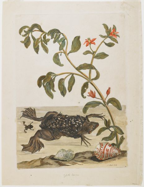 This watercolor, "Red Beetle," was made by an anonymous artist, and is now held at the Minneapolis Institute of Art. The artwork has a clear compositional structure, with a central, spiraling vine directing the eye upward. Note how the artist contrasts the vibrant red of the beetle's wings against the soft yellows and greens of the surrounding flora. This creates a visual tension, drawing our attention to the beetle as a focal point. The precision in rendering each leaf, tendril, and insect segment highlights a formal approach to naturalism. The artist may be commenting on the relationships between the natural world through their arrangement of species; consider how the positioning of each element, such as the beetle resting on the gourd, and the larvae crawling on the vines, creates a narrative. This suggests a carefully constructed semiotic system, where each element functions as a sign within a larger discourse on nature and representation.