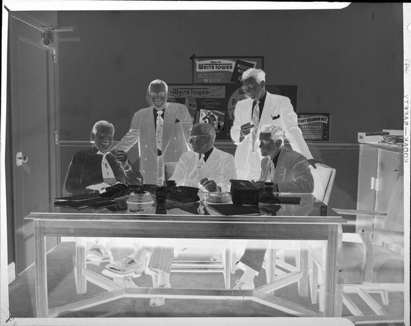 Editor: This photograph, "Untitled (men in Tide magazine office)" by Peter James Studio, shows several men in what looks like an office space filled with magazines. It has a stark, almost ghostly quality. What can you tell me about it? Curator: The photograph intrigues me as it captures labor in a magazine office. Consider the materiality of photography itself: the film, the chemicals, the darkroom labor. How does the photographic process reflect and shape the representation of labor within the magazine industry? Editor: That's fascinating! So you're focusing on the layers of production involved. Curator: Exactly. And what about the men? How does their attire reflect specific expectations of their roles and the social context of their workplace? Editor: I hadn't considered that. Thanks, I'll keep these ideas in mind. Curator: You're welcome. It's all about seeing the layers of production, labor, and social context interwoven.