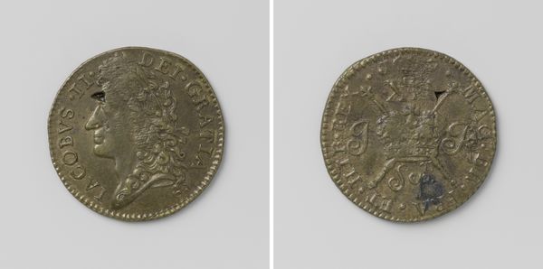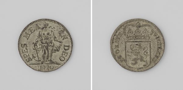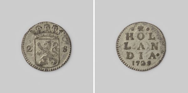Curator: This is a Dutch two-guilder coin from 1682, issued by the province of Holland. Editor: It looks so worn, like it's been clutched in countless palms over the centuries. There’s something romantic about that physical connection to history. Curator: Absolutely. Consider the context. In the 17th century, the Dutch Republic was a major player in global trade. Silver, the coin’s material, flowed in from the Americas, fueling this economic power. The craftsmanship of the coin itself reflects the precision demanded in a commercial hub. Editor: And look at the imagery. On one side, we see the crowned coat-of-arms of Holland with the lion rampant. Lions are nearly ubiquitous as emblems of royalty and courage— but why a lion? What deeper meaning did it hold for the Dutch at that time? Curator: The lion served as a powerful symbol of Dutch identity, a reminder of their strength in a time of ongoing struggles for independence. Think of the guilds and workshops involved in the minting of such coins – each step a contribution to building and projecting an identity. Editor: I'm particularly drawn to the figure on the reverse—a standing woman holding a spear or staff next to a pillar or altar, the Latin text circling around. That imagery invokes classical ideals, a connection to a long tradition of civilization and a message of stability. Curator: The choice of classical motifs highlights the aspirations of the Dutch Republic, evoking a sense of permanence and civic virtue. This symbolism on something as utilitarian as currency shows the deliberate integration of ideals into daily life. Editor: To hold such an object is to touch not only a moment in time, but also a whole symbolic vocabulary and an understanding of labor and the economy that created that system of communication. It is so much more than money. Curator: Indeed. It reflects an economic system in development, the social and historical climate in which this artifact was used, and is an exquisite piece of functional, historical record. Editor: Considering the weight of imagery and time that it contains, even this little piece has the power to teach.