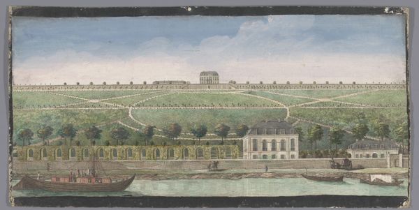 Curator: Here we have Nicolas Pérignon's circa 1780 watercolor drawing, "The Potager of the Hôtel de Valentinois in Passy." A view of a formal garden near what was then the outskirts of Paris. Editor: Ah, it has such a placid, almost dreamy air. The pale blues and greens give it a gentle melancholy, doesn't it? It reminds me of a memory fading at the edges. Curator: Note how the symmetry of the layout creates a sense of order and control, almost like a stage set. Formal gardens like this became popular in France during the 17th and 18th centuries as symbols of power, demonstrating humanity’s ability to tame nature. Editor: Right, but within that formality, look at the figures strolling along the pathways, their clothing almost theatrically opulent against the green backdrop. They seem almost like actors placed deliberately in this organized space. Are they enjoying nature, or performing for it? Curator: An excellent question! These meticulously crafted spaces embodied cultural values, visually encoding status. Water features, for example, and sculptures reinforced messages about authority, progress, and enlightenment. Editor: It’s interesting how such deliberately arranged spaces seem designed to create a specific psychological effect, isn't it? A sense of harmony, perhaps? Though, if you dig a little deeper, it’s a harmony enforced through very human means… through labor, control, resources. Curator: Indeed. Consider that this potager, or kitchen garden, likely provided produce for a wealthy household. Such carefully orchestrated spaces were potent symbols, broadcasting refined taste and immense resources to those fortunate enough to experience it. The image presents an opportunity to examine class structures through a materialist approach. Editor: The choice to use watercolor adds a subtle layer of transparency; as though we, too, are peering through time, witnessing a world constructed carefully, then rendered here so ethereally. Thank you for inviting us to reflect upon such fascinating history! Curator: Thank you, our journey has just begun!