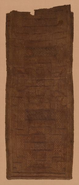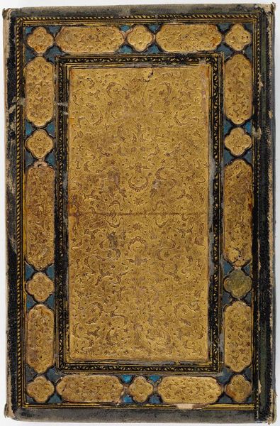 This Qur'an, of unknown origin, presents a compelling study in texture and form. The deep reddish-brown leather, patinated with age, immediately invites a tactile experience. The cover is segmented by geometric structures: a central diamond, corner quadrants, and a border, all defined by metallic inlays. These shapes aren't merely decorative; they function as symbolic markers, organizing the book's surface into a structured field. The overall composition is not just about visual pleasure but directs us to contemplate how such design elements act as a frame, mediating our interaction with the sacred text. Consider how the patina and wear challenge fixed notions of value and beauty. The formal qualities of this Qur'an serve to enhance its cultural and philosophical weight. These are not merely aesthetic choices but are integral to its function as a cultural artifact.