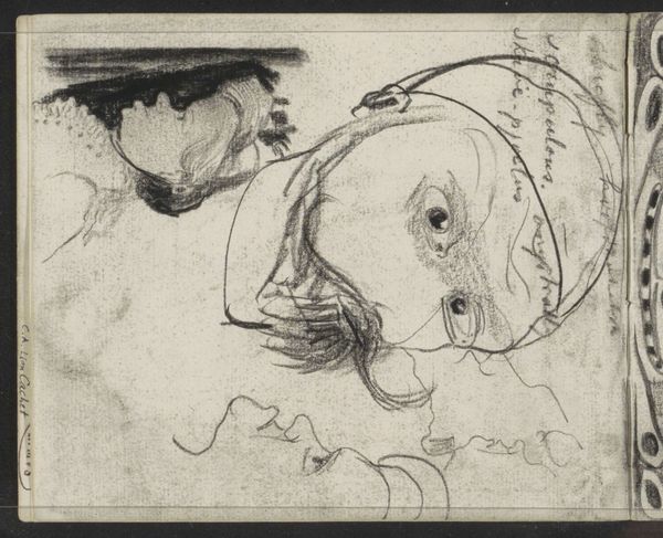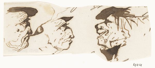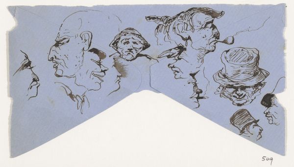 Curator: Before us is a drawing called "Koppen," created sometime between 1840 and 1880. The artist is Johannes Tavenraat, and the medium is ink on paper. It’s currently housed here at the Rijksmuseum. Editor: The immediate impression is one of captured thoughts – a series of rapidly rendered heads. The angularity of the lines contrasts strangely with the otherwise flat, pastel-colored paper on which they're drawn. I almost feel like I'm intruding on the artist's private sketchbook. Curator: Precisely. Tavenraat, working during a period of increasing social realism, likely used these sketches for larger genre paintings or to capture character studies he observed in everyday life. The quick, almost frenetic application of ink implies an interest in capturing likeness swiftly and economically. Editor: Indeed. Look at the variation in line weight! Some areas are barely visible, thin and fleeting, while others, especially around the eyes and mouths, are heavily emphasized. The contrast shapes my experience; it heightens the expressiveness of these fleeting character studies. Do you think these heads were directly inspired by any cultural figures of that time, like maybe people involved in the arts? Curator: It's difficult to ascertain precise inspirations. However, given the historical context, with the rise of bourgeois culture, one could see in these sketches the seeds of social commentary. The figures may very well depict those participating in emerging popular culture, critiquing perhaps their aspirations and attitudes. The tearing around the drawing’s edges suggests these images may have even been deliberately separated or cropped for further display or reference. Editor: That’s a good observation. Viewing them independently versus a part of a greater compilation affects its meaning as well. I am further reminded of caricatures—a technique used at the time to amplify social critiques. Regardless, the emotional value feels rooted in those captured, often unflattering moments. This intimate piece feels like a glimpse into someone’s private perspective. Curator: It speaks to the intersection of private artistic exploration and the evolving representation of society in art. A wonderful bridge between personal creativity and public life! Editor: Exactly. The rapid execution also imbues an inherent honesty, creating both compelling observation and interpretation simultaneously!