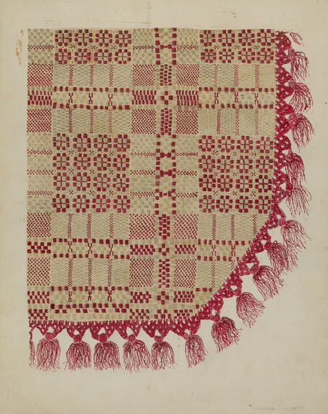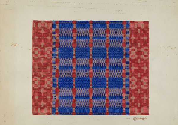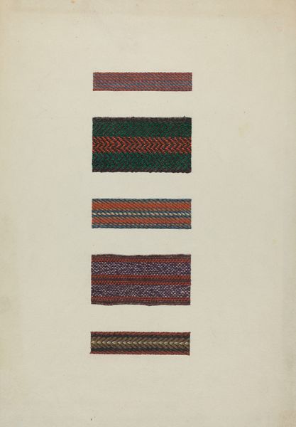 Curator: Before us, we have a "Textile," dating roughly from 1935 to 1942, its creator remaining anonymous, representing Indigenous-Americas artistry through weaving techniques. What are your initial thoughts? Editor: A study in browns and creams primarily, offset with blues and subtle golds. I am immediately drawn to the interplay between horizontal linearity and those fantastic, almost bursting star shapes. There is tension there; the colours contribute to a grounded earthiness countered by an explosion of colour. Curator: It’s intriguing to think about the labor embedded within each woven thread, the community involvement, or lack thereof, in creating such an item. Who would be its likely intended consumer? Where were the raw materials sourced? Were specific workers chosen to achieve this detailed symmetry and harmony that appeals to your artistic sensibilities? Editor: Well, breaking down the visual components further, one sees an arrangement built on repeated, regulated intervals. The artist's methodology clearly adheres to structural rhythms that create satisfying balance; I am also deeply drawn to the formal structure here. Curator: And what can be told regarding economic context of this item? A singular maker expressing purely artistic concepts or maybe a cog within systems of commerce and societal expression, even oppression? How might the piece challenge, reinforce, or re-negotiate prevailing socioeconomic norms? Editor: Undoubtedly there are messages in these shapes; even now in our modern milieu. Curator: Indeed; even material conditions play such crucial parts to a final object's impression on future generations. For me it deepens the understanding as appreciating formal aspects alone is not enough. It should be appreciated considering its social framework! Editor: To think of it in that vein provides such deeper meaning beyond immediate appeal, certainly broadening awareness by considering labor and circumstance which enriches the piece. Curator: It is only when you examine history intertwined with technique that beauty grows richer. Editor: I couldn't agree more—that our different lens converge on a fuller recognition.