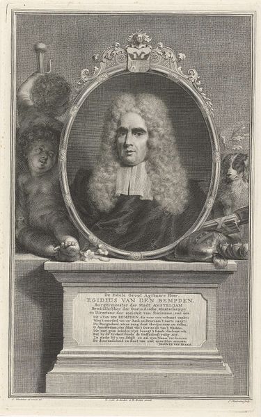 Editor: Here we have Jacob Houbraken's "Portret van Aegidius van den Bempden", an engraving on paper dating from around 1708-1780. The detail in the hair and lace is striking. I'm curious, what are the most interesting visual elements of this piece to you? Curator: From a formal perspective, consider the interplay of line and tone. Houbraken's skillful engraving creates depth and texture, primarily through density and direction of the lines. Observe how the curved lines articulate the volume of the wig, contrasting with the stark lines of the oval frame. Editor: I hadn't thought of the contrast in the linework that way. The wig seems almost to explode from the confines of the oval! Is the oval a standard choice for portraiture during this time period? Curator: It is certainly a prevalent form. Notice how the oval itself is not just a shape, but a construct built from decorative elements, enhancing the subject's prestige through visual association. Also note the heraldic imagery. What might that contribute to the composition? Editor: I see it—almost like a little crown above the portrait. It makes it a signifier of status, setting a tone of nobility or importance. Do you find that the formality limits how deeply you can connect with the subject? Curator: Formality can serve as a frame, setting specific constraints. And yes, those very constraints are precisely what shape the possibilities of its expressiveness and meaning. They help us analyze artistic intention within defined structures, revealing elements which artists play with or subvert for an effect. Editor: That’s an interesting point about limitations. It highlights choices. Now when I look at the heraldry or the detail of the wig, I see how Houbraken created layers of meaning through those visual choices. Curator: Precisely! By considering only the formal properties and theoretical aspects of this artwork, we gain a more nuanced view of what, after all, is only ink on paper.