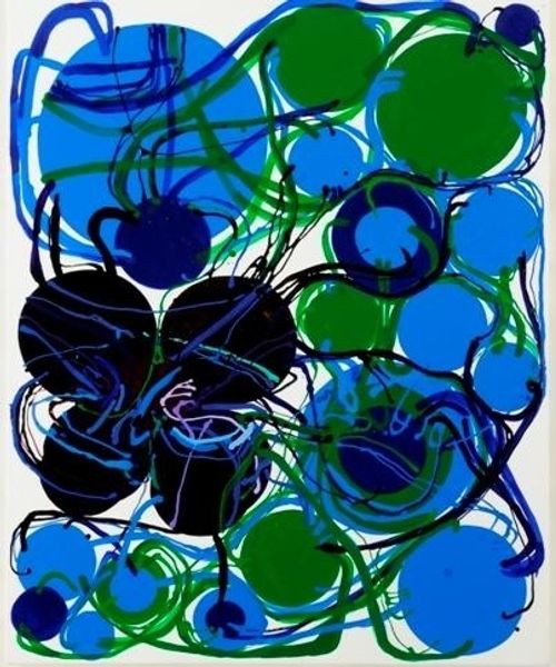 Editor: This is Atsuko Tanaka's "93E," created in 1993 using acrylic paint. The painting is a vibrant, swirling mass of colors and lines – a joyful chaos, almost. What do you see in this piece that I might be missing? Curator: What I find most striking about Tanaka's "93E" is how she utilizes abstract forms to explore the essence of energy and connectivity. The overlapping circles and lines can be viewed as a visual representation of networks, perhaps alluding to electrical circuits, or even organic, cellular structures. Editor: Networks, like connections between things... that makes sense. It does have a feeling of things branching out and connecting back again. So is the title a reference to that, somehow? Curator: Indeed! It invites us to ponder what "93E" signifies. The numerical code perhaps hides another symbol. Think of Tanaka’s earlier works, her exploration of electric clothing, for example. Do you think the work references modernity and connectivity of machines, humans and environment? Editor: That’s interesting… I hadn't considered technology as a theme, but that adds another layer. The colors also seem significant – very bright and almost electric, like neon signs or something artificial. Curator: Consider then that abstract forms offer an invitation to decode and reflect how interconnected the seemingly disparate elements are – much like the abstract systems governing our experiences with reality. Do you now perhaps share an altered interpretation of this striking painting? Editor: Absolutely, now I can appreciate that beyond the immediate visual impact, there's a deeper exploration of connectivity and coded meaning going on here. Thanks so much! Curator: My pleasure! I'm happy to have shed new light to the intriguing painting by Atsuko Tanaka.