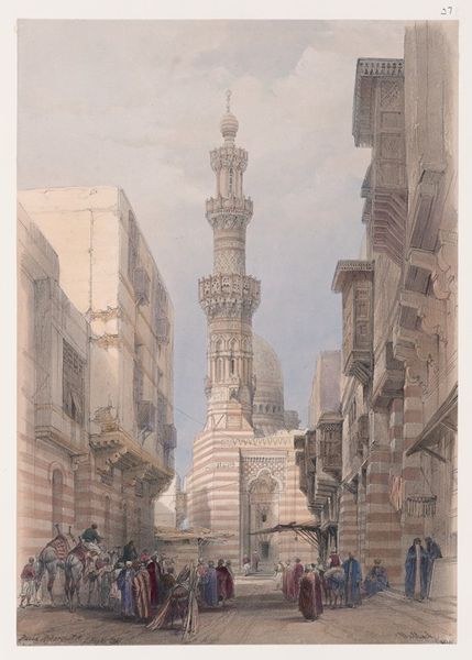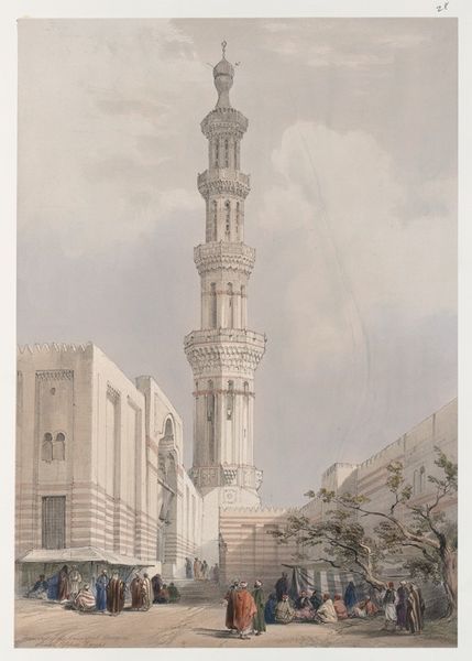 David Roberts created "Ruined Mosques in the Desert, west of the Citadel" using watercolour and graphite to compose a scene dominated by vertical forms against a backdrop of soft, atmospheric washes. The minarets, with their detailed brickwork, stand as testaments to a lost era. Roberts constructs a visual paradox between decay and enduring presence. Notice how the artist uses line and form to guide your eye upward, accentuating the height and structural complexity of the architecture. The juxtaposition of ruined sections with intact portions creates a sense of temporal layering, as Roberts captures the effects of time. The subtle palette of ochres, reds, and greys complements the arid environment, while the deliberate placement of figures offers a sense of scale. Consider how Roberts' artistic vision highlights the formal elements of shape, texture, and spatial arrangement, contributing to an enduring statement about history.