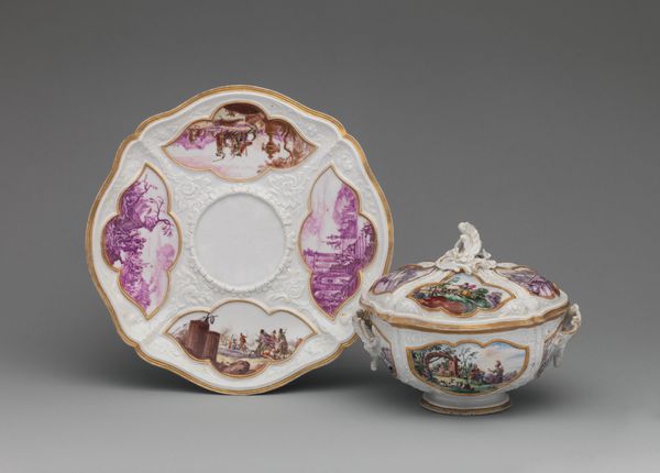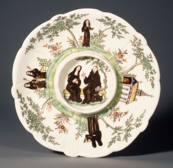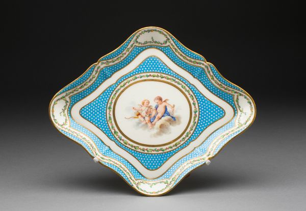 Editor: So, this decorative plate, made around 1785, is attributed to an anonymous artist. It's crafted from ceramic, specifically porcelain, and it's called "-Summer- plate with the crest of Martin". The sepia-toned image of playing children, or are they cupids? is charming. What can you tell us about its historical context and significance? Curator: This piece, with its Rococo style, reflects the artistic preferences of the European elite in the late 18th century. The depiction of children in idyllic play, combined with the family crest, speaks to the era’s emphasis on lineage and the idealization of domestic life. Aristocratic families like the Martins used porcelain, and the imagery emblazoned upon it, as a marker of refined taste, luxury, and social standing. Does that influence how you see this plate, knowing it was meant for the consumption of wealth as much as it was for food? Editor: Absolutely. Knowing it was intended for display or perhaps occasional, very precious use shifts my perspective. It wasn't simply a functional object. The plate became a statement. Was this plate likely displayed or just used during important occasions? Curator: Probably a bit of both, dependent on the family in question. Consider how the creation of elaborate tableware, often displayed rather than strictly utilized, served as a theatrical display of wealth and taste. Such objects, placed within a specific context like the dining room, acted as both social props and tangible representations of power and status, and the cultural currency it brought with it. The political context, just prior to the French Revolution, gives additional depth to this seemingly innocent imagery. What are your thoughts? Editor: Thinking about it as a symbol of power just before the revolution gives it a sharper, almost unsettling edge. What initially seemed like simple charm is loaded with historical meaning. Curator: Exactly! It illustrates how everyday objects can embody complex social and political narratives. That subtext might not always be visible at first glance. Editor: I'll definitely look at decorative arts with fresh eyes. Thanks!