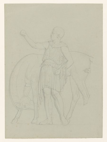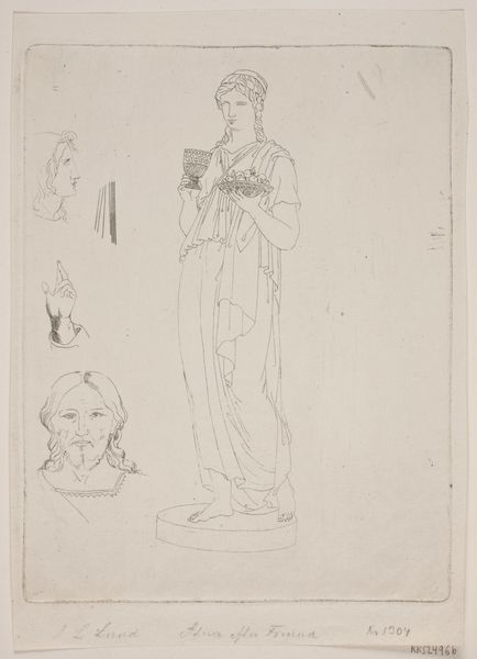 Editor: This is J.L. Lund’s “Brage,” an 1827 pencil and engraving print at the Statens Museum for Kunst. It has such a delicate quality, almost ghostly. I'm drawn to the figure's raised hand. What do you see in this piece, especially concerning that gesture? Curator: The raised hand, especially in conjunction with the lyre, immediately evokes the classical figure of the orator, the poet, the bard. Brage, in Norse mythology, *is* poetry personified. This is Lund participating in a long tradition of visualising cultural memory. But consider, too, the medium - engraving. Isn't it interesting that printmaking is used to disseminate a figure whose very essence is linked to *oral* tradition? Editor: That's a great point about oral tradition meeting printmaking! It's like he's being memorialized in a new, reproducible way. Does that relate to the three faces sketched to the side? Curator: Precisely! They suggest multiple aspects, perhaps different stages of inspiration, different faces of poetry. It's almost as if Lund is trying to capture not just the likeness, but the very *idea* of Brage. Note also the classical, almost neoclassical style. Lund anchors Brage within the visual language of the Western canon, elevating him, giving him that weight of cultural legitimacy. Editor: So it's about more than just depicting a mythological figure, but really connecting Norse mythology to a wider cultural heritage. Curator: Exactly. And isn't that precisely what images do, at their best? They don't just reflect, they connect, they remind, they *re-present*. Editor: I never thought about it like that, seeing images as actively creating cultural links. Thank you for broadening my perspective! Curator: My pleasure. It's in these connections that images truly speak to us, even across centuries.