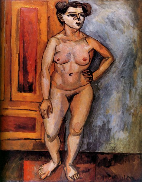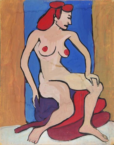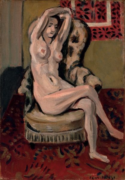 Curator: Henri Matisse’s "Nude, Spanish Carpet," completed in 1919, offers a fascinating study in the arrangement of form and color. He deploys oil paint here to investigate an interior scene with a nude female figure. What's your initial response to this artwork? Editor: Immediately, I’m drawn to the faceless figure, a powerful symbol, paradoxically highlighting vulnerability and universality. She could be anyone, any woman throughout history, yet feels exposed and anonymous. Curator: Indeed. Note the deliberate simplification of form; the geometric shapes of the carpet play against the curving lines of the figure, creating a dynamic tension. The cool blues of the window juxtapose beautifully with the warm ochres of the carpet and the flesh tones, constructing a balanced visual harmony. Editor: The carpet, in particular, functions symbolically, a cultural artifact implying domesticity and perhaps even imprisonment, considering the woman's confinement within the interior space. The traditional patterns evoke a sense of history and constraint. Curator: From a formal perspective, consider how Matisse utilizes the planes of color to create depth and spatial relationships. The flattened perspective is consistent with his engagement with modernist ideas concerning painting as an object, not a window. Editor: Yes, and I also interpret those planes as psychological barriers. The absence of the woman’s face emphasizes the gaze directed upon her, raising questions about the objectification of women in art, and who is doing the watching, artist or viewer? Curator: The artist’s touch is clearly visible. You can examine the brushstrokes closely, appreciating the surface quality of the paint itself. Matisse’s materiality reveals much about his creative process, as seen through expressive handling. Editor: Ultimately, the painting is a confluence of symbol and form. The tension between the cultural markers of the carpet and the vulnerability of the figure offers enduring narratives, raising concerns of representation, interiority, and objectification. Curator: Exactly. In exploring how visual elements converge, this piece gives us great insights into Matisse's pictorial project and his experimentation with composition. Editor: And by understanding the embedded symbols, we understand the cultural weight an image like this continues to carry.
