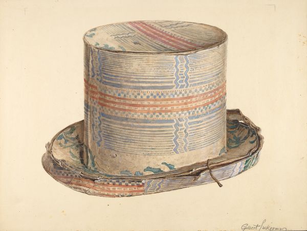Editor: Here we have Max Soltmann's "Man's Hat Box," dating from around 1937, done with watercolors. The decorative elements really jump out, almost overwhelming the object itself. How would you unpack the materiality of this? Curator: Well, let's think about this hatbox not just as a container, but as an object of production. Who was making these boxes? Were they mass-produced, hinting at emerging consumerism? Or handcrafted? That changes its social standing considerably. Editor: So the materials used, like the paper or cardboard of the box itself, and even the watercolors, tell us something about its economic value and who might have owned it. Curator: Precisely. Consider the surface. The decorative floral patterns. What’s their source? Are they inspired by William Morris designs? And how are they applied? Is it printed, painted or wallpaper? It is an appropriation of high design for everyday use or does the very act of embellishment elevate this box beyond its utilitarian purpose? We can explore the boundaries between "high art" and craft. Editor: That's a great point about blurring those boundaries! I initially just saw a pretty box, but looking closer, I’m questioning the labor and value involved in something like this. Curator: Exactly! Think about it, each step, from creation to consumption is a point to ask 'why'? Even down to what hats are being carried, and the purpose, occasion or place the owner might be taking this particular hatbox to! Editor: Now I’m seeing this less as a simple still life and more as a tiny, almost subversive, social document. It opens a door into understanding production and class! Curator: Indeed. By focusing on materials and their origins, the artist pushes us to examine our relationship to everyday objects and question the assumptions we make about value. Editor: I never thought I'd find so much complexity in a hatbox! Thanks, that's given me a whole new way of seeing.