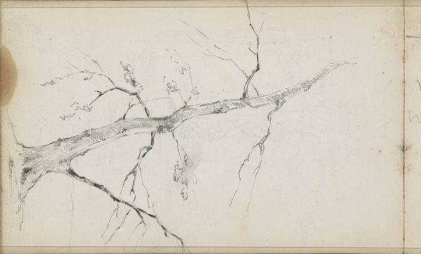Curator: It's stark, almost melancholic. The bare branch dominating the frame... it gives me a sense of quiet observation, a lonely sort of beauty. Editor: We're looking at "Kale tak en een tak in bloei", which roughly translates to "Bare Branch and a Branch in Bloom." This drawing in pen and ink comes to us from Maria Vos, and was likely made sometime between 1856 and 1870. Curator: Vos has captured a juxtaposition here, a moment of transition. One branch barren, reaching out, the other bursting with life. It’s like a visual metaphor for… resilience, perhaps? Editor: The Rijksmuseum holds this small work, and I find myself thinking about its place in the visual culture of its time. Landscape drawings, particularly those emphasizing the natural world, enjoyed renewed popularity amongst a growing middle class. A scene like this resonated. Curator: But is it just the realistic depiction that captivated viewers? Or could there be something deeper? In many traditions, trees represent connection between the earthly and the spiritual realms, branches symbolizing family lineages. Maybe the starkness suggests something more personal to Vos? Editor: That's interesting. Maybe so. Considering Vos's own life within a rapidly changing Netherlands, might we also see this artwork reflecting broader societal tensions: the fading agrarian life against the booming cities? Curator: Absolutely. The starkness might represent a fading past, with that hopeful branch symbolizing a tenacious future. It resonates beyond a simple landscape sketch. Editor: Regardless of intention, it’s fascinating to see how a seemingly simple drawing can contain layers of meaning when viewed through the lenses of history and symbolism. Curator: Indeed. Even today, looking at it, I find a renewed sense of nature's cyclical beauty. Editor: A quiet, potent observation for us to carry into our day.