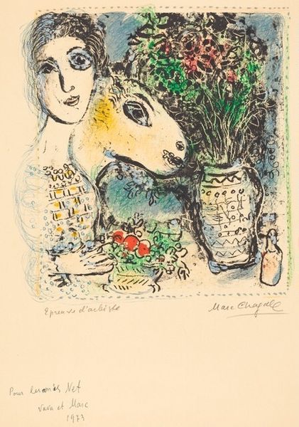 Marc Chagall created this greeting card with lithograph on paper, its date is unknown. Chagall was a Jewish artist whose work was deeply influenced by his cultural heritage and personal experiences. This image speaks to the tender exchanges between people. The man holding a bouquet could symbolize love, respect, or reconciliation, suggesting themes of affection and connection. The faces and the bird floating in the background add a dreamlike quality, typical of Chagall's style. Chagall lived through major historical events like the Russian Revolution and two World Wars, so his identity was often in flux. His art often reflects a longing for peace and unity. The card invites us to consider the importance of simple acts of kindness and the emotional power of giving. It is a reminder of the importance of human connection, especially during uncertain times.