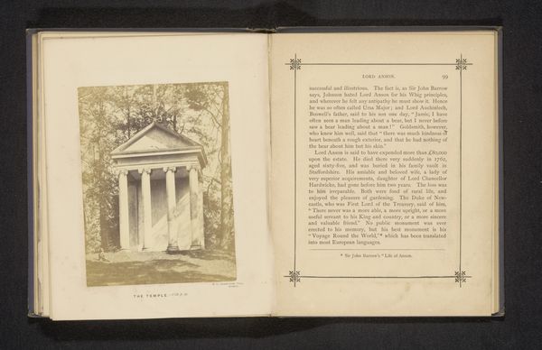 Curator: Editor: This is a photograph of the Tombstone of the uncle and aunts of Sir Walter Scott in Kelso churchyard, created before 1880. It has an undeniably somber quality, enhanced by the monochrome palette. What draws your eye in this image? Curator: My attention is directed towards the relationship between the textures. Notice the rough, almost granular surface of the stone in the tombstone against the smoother texture of the surrounding brickwork. Consider how this contrast affects our perception of depth and volume. How do these material qualities influence your interpretation of the subject matter? Editor: It definitely makes the tombstone feel ancient and weighty, solid within the open pages of the book! Do you see a narrative playing out with the tombstone presented within the book page? Curator: Precisely! Think of the composition. The photograph itself is carefully positioned on the page, framed by text that presumably provides context or commentary. This layering creates a meta-narrative about documentation, preservation, and the mediation of history. Note that the text softens the appearance of the heavy burial stone. The interplay of textures becomes crucial; the smooth paper of the book contrasting with the stone in the photograph creates a tactile experience, a dialogue between the object and its representation. What else do you observe? Editor: I see a visual juxtaposition of the tangible stone and the written narrative on the book’s pages. Almost a dialogue about materiality, legacy, and historical narrative within the composition itself. I didn't catch that nuance at first glance. Thanks! Curator: Indeed. By dissecting the formal qualities – the textures, compositions, and the interplay between object and its representation – we reveal how meaning is constructed within the photograph itself.