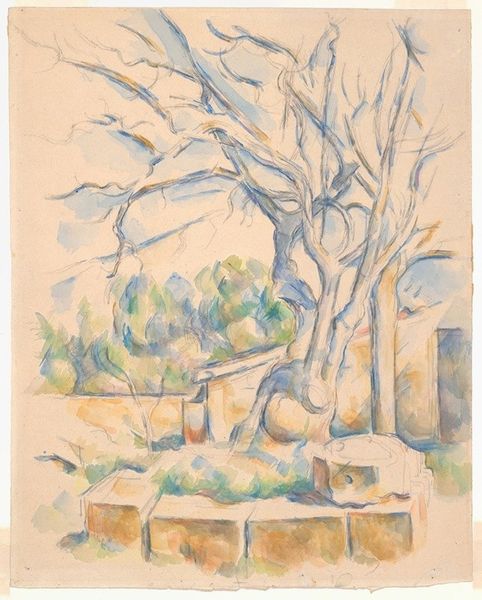 Editor: This is Wijnand Otto Jan Nieuwenkamp’s "Gezicht met cactus op de berg Vesuvius vanuit Sorrento," made sometime between 1884 and 1950, using colored pencil and other media on toned paper. It's a lovely, light sketch, almost like a page from a travel journal. I’m really struck by how the artist chose to frame the imposing Vesuvius with the very tactile cactus in the foreground. What do you see in this piece? Curator: It’s interesting how Nieuwenkamp places the viewer, both physically and culturally. The vibrant cactus, a symbol of resilience and adaptation, almost acts as a lens. We’re not just looking at Vesuvius; we’re looking at it through a distinctly Sorrento-tinged perspective. How might this framing, this conscious choice of foreground, influence our reading of the volcano itself? Is it tamed? Is it a symbol co-opted into the Grand Tour aesthetic? Editor: That's fascinating! I hadn't thought about it in terms of power dynamics and tourism. The volcano seems almost decorative, less of a threat than just a picturesque backdrop. Curator: Exactly! And consider the historical context. During the period this was made, views of Vesuvius were extremely popular with tourists, often romanticized in paintings and souvenirs. Nieuwenkamp's work fits into this tradition, but it also subtly questions it. The loose lines and sketch-like quality disrupt any sense of pristine grandeur; they remind us that this is an individual's impression, a moment captured. Do you think he's participating in or critiquing this tourist gaze? Editor: I see your point. The medium itself feels more immediate and personal than a highly polished painting. Maybe it’s a bit of both – enjoying the view, but also acknowledging the artificiality of the whole tourist spectacle? Curator: Perhaps. It leaves us pondering how art participates in constructing our understanding of landscape and its cultural significance. It also makes me wonder how contemporary artists engage with these well-trodden iconic sites. Editor: That’s really given me a new perspective on what initially seemed like just a pleasant landscape drawing! Thanks!