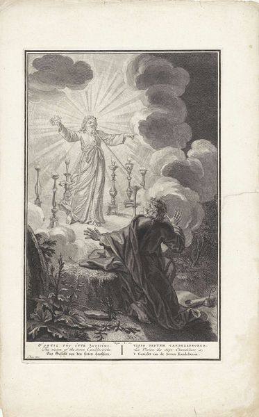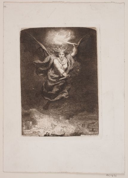 Curator: A radiant being stands triumphant atop the world, issuing a clarion call—quite the composition. Editor: Indeed. We are viewing George Kockers’ engraving from 1814, housed in the Rijksmuseum. The full title is “De morgenster van de overwinning op de verslagen overblijfselen van het leger van Napoleon,” or, “The Morning Star of Victory over the Defeated Remains of Napoleon’s Army.” It’s… overwrought, but captivating. Curator: Overwrought? It’s symbolic, not merely representational! The angel, rendered with striking chiaroscuro effects typical of the baroque style, embodies a carefully constructed semiotic system. Notice the celestial light emanating behind her. Editor: I note it. But that very celestial light washes over the literal remains of Napoleon’s army, rendered as discarded weapons and bodies beneath the clouds. Kockers made this shortly after Napoleon’s defeat and the restoration of the House of Orange. There’s an obvious attempt here to tie Dutch national identity to this victory and perhaps even divine right. Curator: And what of that trumpet, bearing text? Its purpose isn’t merely sonic; the inscription itself is a vital structural component of the whole image. Text and image synthesize to complete the sign. Editor: I agree that its semiotic charge is relevant. But it also speaks directly to the historical context. This isn't just any angel, it's the allegory of victory proclaiming a specific, contemporary political triumph and national rebirth. The strategic display of power is pretty overt. Curator: So you’re interpreting it as propaganda? Reducing complex visual interplay into base political messaging? The figure stands tall because of compositional design not politics. Editor: I am only contextualizing that formal achievement within the print’s function, considering the social framework within which the print gained currency. Understanding these works of art necessitates awareness to not only its visual dynamics but how these were marshaled for institutional authority. Curator: A stark contrast of opinions, if I must say, proving once again, an image is only seen for the structure and signs within or by the politics they represent. Editor: And now both, inevitably, part of history! Thank you both.