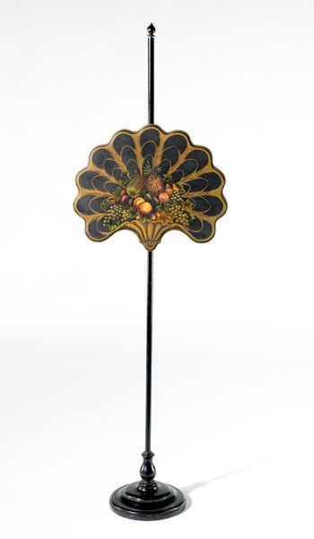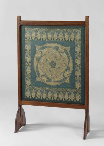 Editor: Here we have an anonymous Fire Screen, dating from 1790 to 1812. It's comprised of wood and textile, and is now held at the Art Institute of Chicago. The diamond shape, coupled with the floral fabric, strikes me as both quaint and elegant. How would you interpret this work from a formalist perspective? Curator: Its charm indeed stems from the convergence of shape, material, and surface decoration. The geometric exactness of the diamond contrasts with the organic, curvilinear forms of the floral pattern. Editor: Do you think the textile's colour has an impact? Curator: Assuredly. Note how the somber ground enhances the vitality of the floral motifs; the rust and olive palette functions as the foundation that propels the cerulean, beige, and coral botanicals to prominence. How might you characterize the relationship between utility and art here? Editor: Well, it’s designed to block heat, but it also strives to be beautiful; the textile choice indicates function following form. The floral detail serves more as art. Does this relate to Arts and Crafts ideals? Curator: Precisely. The Arts and Crafts movement elevated craft to an art form. We also see that reflected in its construction: note the tripartite stand's refined, fluid design in a sturdy, practical form that also evokes grace and harmony. Editor: The close study of the forms definitely allows one to notice subtle complexities and details. Curator: Absolutely, it invites a slower, more considered form of observation and appreciation. Editor: Thanks to your Formalist approach, I learned to notice the dialogue of form and materials, and how they construct meaning within the object itself.
