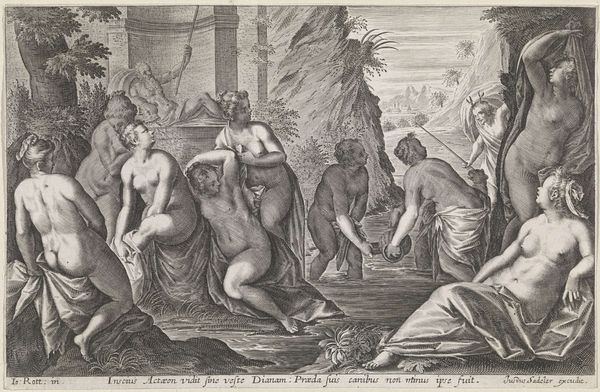Curator: This is Aegidius Sadeler II’s print, "Diana, Surprised by Actaeon," residing here at the Harvard Art Museums. The scene depicts the mythological encounter with striking dynamism. Editor: My first impression is one of intense vulnerability. The figures are caught in a moment of exposure, both physically and emotionally. Curator: Absolutely. Sadeler's print participates in a long tradition of representing this myth, often reflecting anxieties around power, transgression, and social order. Who is allowed to look, and what are the consequences? Editor: Visually, the dogs accompanying Actaeon contribute to that sense of inescapable fate, foreshadowing his transformation and demise. They are instruments of both his doom and Diana's wrath. Curator: Indeed. The print's circulation in its time would have reinforced established hierarchies while also perhaps offering a vicarious thrill in witnessing the disruption of those hierarchies. Editor: Looking at it now, I am struck by how this image continues to resonate with contemporary themes of privacy and the gaze. Curator: It's a testament to the enduring power of myth and the ways artists interpret and adapt them to new cultural landscapes.