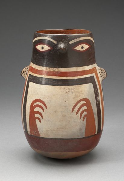 This is a ceramic beaker in the form of a head, made by an artist from the Nazca culture of ancient Peru. The beaker's painted decoration represents a human face with stylized features such as bold eye markings. The Nazca people flourished in the arid coastal region of Peru from around the first century AD to the eighth. Their society was highly stratified, and it's thought that beakers like this one were used in elite rituals to display social status. The face is believed to represent a human head or a human-animal hybrid and they are a powerful image from this time. Art historians examine archaeological evidence, iconography, and the wider social and political context to understand the role of such objects in ancient societies. This helps us better understand their rituals and beliefs, and gives us a sense of the social values that shaped ancient Nazca society.