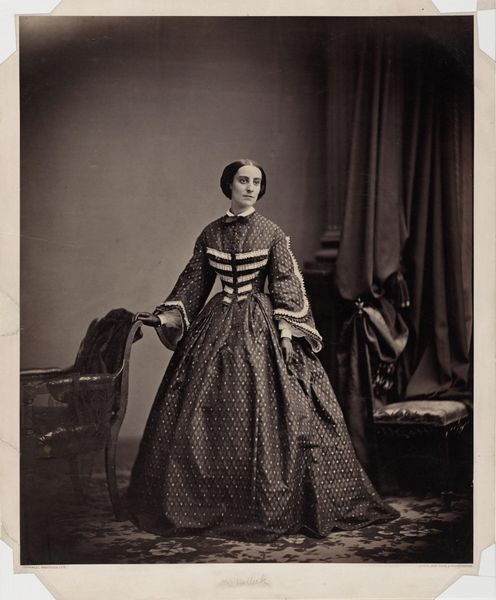 Curator: I'm struck by how raw this portrait feels. It's titled "Studioportret van een vrouw, Parijs," or "Studio Portrait of a Woman, Paris," created back in 1853. It's the work of Eduard Isaac Asser, a daguerreotype, a very early form of photography. There's a realness to it that's arresting. Editor: It's definitely holding something back, wouldn’t you say? The formality of the studio contrasts dramatically with the sitter's solemn gaze and how she is positioned in relation to the other compositional elements of the shot. I’m immediately drawn to the table next to her which displays a decorative motif, something resembling leaves or perhaps peacock feathers. She doesn’t look entirely comfortable, there's tension in her posture, it lends the work an intriguing mood. Curator: I think you're spot on about the tension. This process was so new then, so laborious! Imagine sitting still for that long, under those conditions. It couldn't have been comfortable, no soft filters! But it allowed the viewer to be right there with the subject. Her ornate lace trim, puffy sleeves and patterned table covering reflect wealth and attention to detail which she might otherwise enjoy in daily life, it seems that being put on display so starkly brings out feelings of insecurity and worry in her posture and expressions. Editor: Indeed, notice how Asser strategically employs a formalist, symmetrical approach here. The woman's features are presented without artifice, and with direct gaze to give prominence and immediacy to her inner emotional state. Curator: Her hair is piled in a peculiar configuration atop her head in two sections, resembling devil’s horns! I wonder if there's a hidden bit of rebellion there. Or maybe that was just the style. But the way her gaze meets the viewer—almost daring you to judge, there’s definitely strength there too! Editor: Absolutely. The tonal range and chiaroscuro are subtle yet significant. This highlights both her form and clothing but leaves dark shadows to draw your eye upward toward her solemn, worried face. The effect suggests an inner psychological landscape beneath her calm surface and is something of a masterclass in subtle composition. Curator: Looking at it this way has made it so fresh and alive again. To think about her inner landscape existing and on display is a little voyeuristic but gives a new way of reading old portraiture. Editor: Indeed, it challenges the way we conventionally perceive and interact with early portraiture—revealing that a portrait offers more than mere reproduction.
