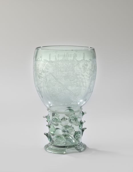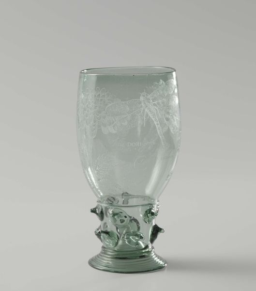 This is a Roemer glass, crafted by Maria Tesselschade Roemers Visscher. Notice the interplay between the smooth, translucent body of the glass and the tactile, almost organic texture of the applied prunts around its stem. The prunts, small blobs of glass with a raspberry shape, create a rhythm that is both decorative and functional, providing a grip. The cool green tint enhances the glass's natural qualities. Observe the delicate white calligraphic inscription, it contrasts with the glass's weight, adding a layer of intellectual and aesthetic refinement. Roemers Visscher, celebrated for her calligraphy, uses this skill here to elevate a functional object into a work of art. Consider this Roemer as more than a drinking vessel. It embodies a fusion of form and function, craft and intellect, inviting us to contemplate the rich interplay between materiality and meaning.
