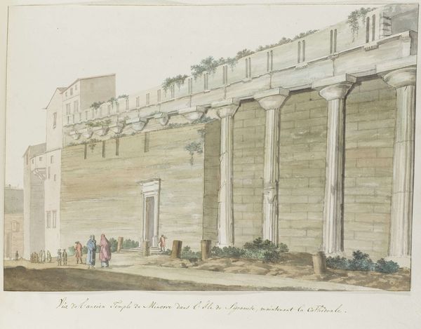 Curator: This watercolor, rendered between 1846 and 1849 by David Roberts, offers a lateral view of the Temple of Dendera, once referred to as the Typhon\u00e6um. Editor: It's evocative, isn't it? There's a real sense of stillness, almost melancholic. The pale washes create a delicate contrast with the monumentality of the architecture, like a ruin fading into memory. Curator: Roberts was part of a broader 19th-century phenomenon, where artists documented ancient sites in the Middle East, contributing to a growing fascination with Egypt within European society. These images also aided the project of archaeological reconstruction back home, fueling popular exhibitions and influencing design. Editor: Indeed, but who was this art made for, exactly? It's hard to look at these kinds of paintings now without thinking about the power dynamics at play. Here we have an artist from Britain, then the world’s dominant superpower, capturing Egyptian antiquity for a European audience already predisposed to viewing non-Western cultures as something to be studied and possessed. The three figures are almost faceless in a society viewed under the colonizers lens. Curator: That’s a valid critique. And we can look at the composition. Notice how the artist frames the temple, emphasizing its scale, presenting it almost as a landscape feature. The human presence is downplayed. Consider the act of documenting and portraying a site as an endeavor shaped by prevailing beliefs and systems of thought. It raises critical issues regarding the ethics of representation. Editor: The lack of vibrant colors also strikes me. Was it intended to emphasize a kind of timelessness, or to suggest the faded glory of a lost civilization to the western public? Or maybe it points to a certain romanticism that romanticizes decay? It's subtle propaganda about western cultural heritage and eastern civilization. Curator: Roberts, however, meticulously transcribed architectural details. The columns with their ornate capitals, the hieroglyphs—evidence of an attempt at scholarly accuracy for the artist, regardless of how the images are ultimately viewed. It's also essential to see works such as this in the historical moment from which they arise. Editor: Agreed, by contextualizing it as a product of its time, we gain a richer and ultimately more complicated comprehension. Still, these views are also about whose voices were excluded in these works from western perspective and power. Curator: Thank you for helping our visitors look deeper, consider that context, and ask such pertinent questions. Editor: My pleasure. I think considering all that contributes to a more thoughtful and more critical appreciation.