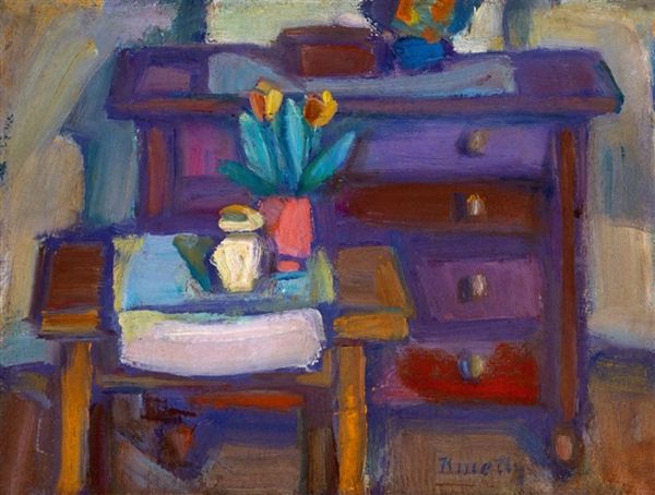 Kmetty János made this ‘Big Still Life with Flowers’ with oil paint, at an unknown date. The painting has a kind of casual, blocky feel, like a Sunday painter just having a go. Looking at the surface, the paint is laid on pretty thick, you can see the marks where the brush has been dragged across the canvas, especially on that bright yellow table. The blue of the walls and vase feels almost chalky, and contrasts with the brighter oranges and yellows of the other objects. It gives the painting a kind of muted, dreamlike vibe. I keep coming back to that little yellow apple. It's just sitting there, this tiny, cheerful accent amidst all the blues and pinks. This feels like a conversation with someone like Morandi, who also made a career out of painting humble, everyday objects, but János brings his own slightly wonky, charming voice to the conversation. There’s a real sense of freedom, an embracing of the accidental, that makes it so appealing.