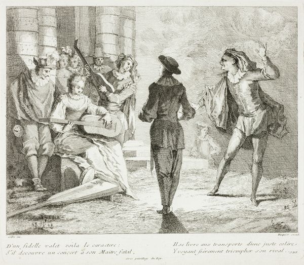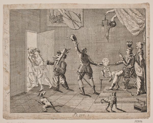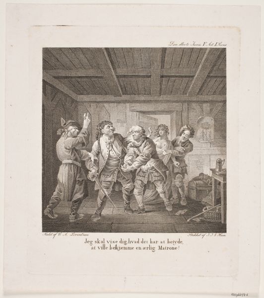 Curator: Let’s turn our attention to this engraving by Charles Grignion, made in 1793. The scene illustrates a moment from Tobias Smollett's novel, "The Expedition of Humphry Clinker," and is titled "Lord Oxmington Repelling Lismahago's Challenge to Single Combat." Editor: Oh, chaos in a drawing! I immediately sense the pent-up tension of a moment about to explode. The scene is crammed with figures, their expressions ranging from outright fear to strained composure, but their bodies convey drama. Curator: Precisely! Grignion used etching and engraving to capture this charged narrative. Observe how the tight linework builds a sense of confinement within this interior setting. Can you elaborate more about that effect, maybe referring to the medium? Editor: As you mentioned, the engraving is very meticulous, reflecting the detailed labor needed. Look closely, and you’ll see that Grignion varied line thickness, creating areas of light and shadow, while textures simulate different fabrics and materials. This would require significant labor hours – something the readership most likely took for granted in consuming prints at the time. Curator: True. It’s quite an interesting commentary on the consumption of conflict here. Speaking of which, consider the moment he chose to represent. Lord Oxmington, poised and disdainful, holds off the agitated Lismahago, as their companions intervene. It is not exactly a moment of decisive action but one pregnant with possibilities, maybe mirroring tensions in the consumerist society he engraved within. What does it bring to your mind? Editor: Absolutely, I see in Oxmington a man refusing to act on the passion Lismahago is feeling, even belittling him; it reminds me that these dramas in ink are also social performances, commenting on restraint, violence and class division that are mediated via prints to be reproduced on mass scale for drawing rooms, books and all manner of decorative objects. The story in its first rendition must of had similar social ramifications as Grignon's interpretation. Curator: An incisive reading. I hadn’t considered how the scene, rendered through Grignion’s labor-intensive technique, gains additional significance with all the possible reiterations of it after his engraving work! Editor: It's interesting to think how such an intense scene becomes tamed into something neat and manageable to observe.