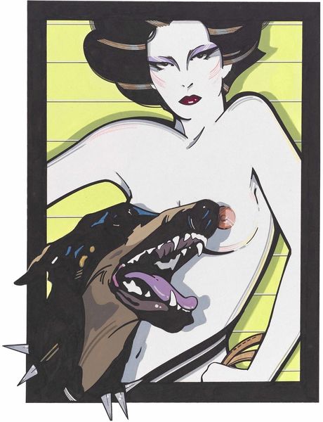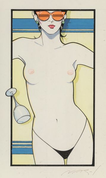 Curator: Immediately, the image projects a slick, almost untouchable cool. There’s a striking economy of line. Editor: Indeed. We are looking at Patrick Nagel's "Nude with Sunglasses," and it’s precisely this studied coolness that makes it a product of, and a commentary on, its time. Nagel created illustrations often published in magazines and best known for the simplified female figures of his style. Curator: Let’s talk about that simplicity. The limited color palette, the precise outlines. There's something very stylized, bordering on iconic, in how the figure is reduced to its essential forms. Look at the hair, the glasses—almost geometric. Editor: Exactly. Those stylistic choices resonate deeply with the broader narratives of the 1980s. This decade fetishized wealth and a kind of detached glamour. Nagel's work is complicit in this—glamorizing a figure of almost unattainable perfection and perhaps mirroring broader themes related to hyper consumerism and the objectification of women prevalent in advertising and media at the time. The pose, the bare chest, it all speaks volumes about how female bodies were being consumed, represented, and idealized. Curator: But, isn’t the graphic quality appealing on its own merit? Regardless of what the era was doing? The balance achieved using such limited means is commendable. I find it compelling that so few elements are used to depict an immediately recognizable character. Editor: Of course, but formalism alone strips away so much of its meaning. We miss how this kind of detached female form contributes to, and perhaps even reinforces, gendered power dynamics of that period. Her body is presented for the viewer's gaze. The sunglasses—is she protected, or hiding? This demands critical consideration. Curator: I grant you it has the power to trigger a critical reaction. However, from the purely compositional perspective, it achieves remarkable equilibrium. And for this achievement alone, this artwork succeeds. Editor: It seems we may simply have to disagree on the function of its success, for its compositional elements, I think, tell us a bigger story. It encapsulates its decade, reflecting its contradictions and anxieties. Food for thought.