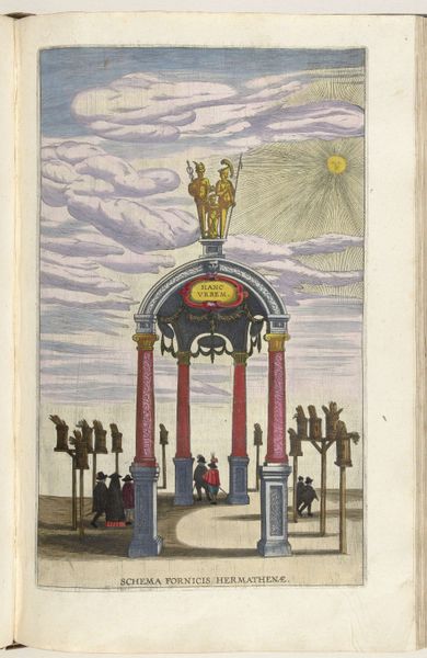 This hand-colored engraving of a Triumphal Column was created in 1599 by an anonymous artist, and commemorates a monument dedicated to Archduke Albert and Isabella, sovereign rulers of the Spanish Netherlands. The engraving depicts a column topped by a statue of Victoria, the Roman goddess of victory. But the triumphal arch shown here is also a cultural artifact, a piece of political propaganda designed to project an image of strength and stability. The column is flanked by statues of Albert and Isabella and the Latin inscriptions at their bases tell of the virtues and honors they embody. The original column, of which this is just one representation, was erected during a truce in the Eighty Years' War, yet it was destroyed by the people of Brussels shortly after its completion, a sign that the Spanish rulers were not as popular as they wished to appear. As historians, we look for the symbolism and rhetoric that were called upon to imbue the image with authority. By studying the visual codes and cultural references of this print, we can learn more about the complex political landscape of the Netherlands during this period.