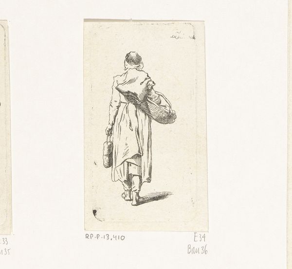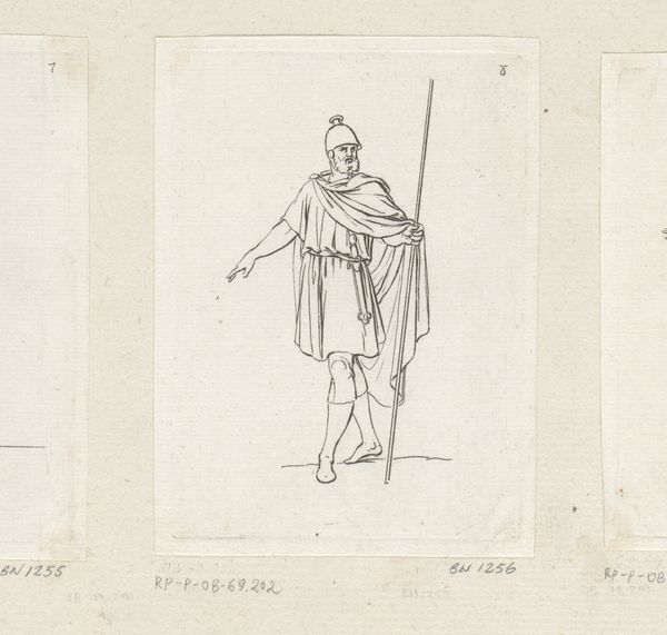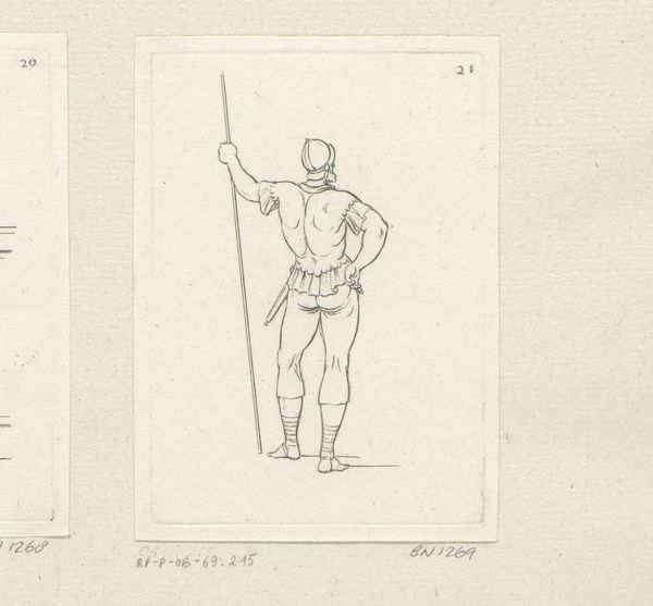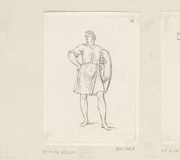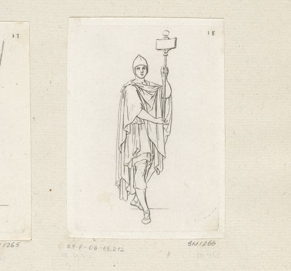 Editor: This is "Man met veldteken," a pen drawing on paper from 1706 by Sébastien Leclerc I. It seems to be a sketch of a figure holding some kind of standard. The lines are simple, almost like a fashion drawing, and it makes me think about Roman soldiers or something similar. What do you see in this sketch? Curator: Immediately, I consider the materiality of this piece. Leclerc uses relatively inexpensive and readily available materials—paper and pen—to produce this image. Notice the rapid, efficient strokes, suggesting a production meant for widespread consumption rather than a singular masterpiece. How does this accessibility influence our understanding of the subject matter, this figure holding what appears to be a military standard? Editor: That's interesting. So, the material and the way it was made affects the subject? Curator: Precisely. The relative ease of production allows for wider dissemination and perhaps even a subtle critique of power. The very act of depicting this "Man met veldteken" in such a common medium democratizes the imagery of authority, moving it from the realm of the elite to a broader public sphere. Consider how the artist's labour here, quickly rendering an image with readily accessible materials, contrasts with the power represented by the "veldteken" or military standard. Editor: I hadn't thought of it that way, seeing it less as an individual portrait and more as a kind of reproduced symbol through easily obtained materials. Thank you for opening my eyes to the idea that the work is intrinsically linked to the society where it was made! Curator: The link between artwork and its historical background are key. The social history of its creation is intrinsically embedded in the artwork itself!