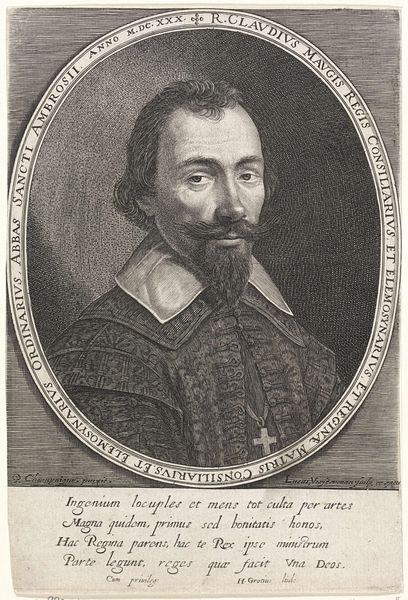 Curator: Let’s consider this engraving titled "Portret van Adriaan van den Spiegel." It dates back to 1645 and was crafted by Jeremias Falck. The image presents a three-quarter view of its subject, framed within an oval border containing detailed lettering. Editor: My first impression is of formality. The fine lines of the engraving create a somewhat austere and intellectual mood, befitting the subject, no doubt. There is a concentration of visual activity at the top of the image that contrasts the empty space below. Curator: Indeed, the artistry lies in Falck’s rendering of texture and depth with a relatively limited medium, engraving. He utilizes the contrast between the darkness of the engraved lines and the white paper to build up the portrait. Also, considering the historical context of printmaking, this would have served as a more easily reproducible and disseminated image of Van den Spiegel, influencing his public perception. Editor: Notice the way the formal elements, like the line work around the face, contribute to a perception of realism and idealization simultaneously. The engraver has used precise details and clear outlines that allow the likeness of Van den Spiegel to emerge as a distinct persona. I would assume there's an effort at play to not only document physical traits but also project certain societal values onto the person through the design, but I am no expert on medical history or portraiture! Curator: It certainly encapsulates an ideal image of the learned professor and gentleman, aligning with Baroque portrait conventions. And the details of the chains and rich materials that create this visual texture you observe denote status and profession, emphasizing both intellectual and economic capital. Editor: Exactly. The portrait encapsulates certain values inherent in visual and political representation—in any case, this Baroque image demonstrates a meticulous dedication to realism. Curator: Understanding its accessibility and wider distribution, facilitated by the medium itself, gives insight into the production and consumption of portraits beyond the painted canvas. It opens a new dimension to exploring themes of representation. Editor: Thinking about that level of detail—how those lines construct and convey not only the material richness of the period’s fashion but also the status implied—is, for me, the core pleasure of observing this type of work.
