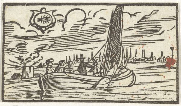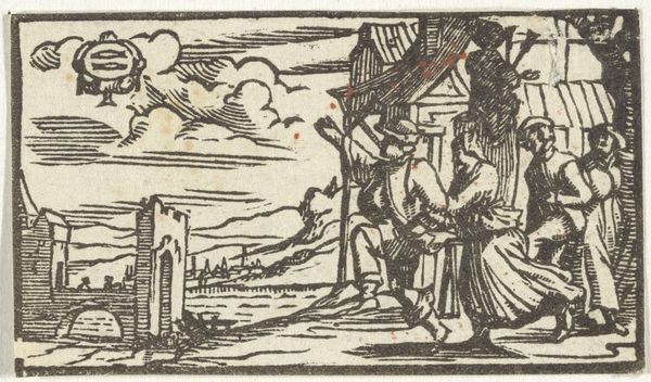 Editor: This woodcut, called "Juli", from the 17th century, by an anonymous artist, really gives the sense of looking in on a scene. Almost like peering into someone's everyday life in a distant century. What social and cultural contexts shaped images like this one? Curator: Well, the rise of printmaking in the 17th century democratized image production and circulation. These types of scenes – landscapes with peasants working, resting, sometimes feasting – weren’t new, but the possibility for broad consumption was. Notice that the image is paired with a sign that depicts an Ox above the landscape. Editor: I did see that little drawing of the Ox at the top. What would it signify in this composition? Curator: It might well signify the Zodiac sign Taurus, linked to the month of July, right? These prints were created as series illustrating calendar pages and months. Do you see how the work depicts various stages of agricultural production that are specifically associated with the summer season? This brings into focus how images served as calendars of sorts. They visualized temporal rhythms of the world as then perceived and made them readily available to larger groups of people. How does knowing this, change your appreciation of it? Editor: It totally recontextualizes the scene. It's not just someone's life; it is representative of time, the world around them, and of shared experience! These images weren't simply aesthetic; they shaped our understanding of time and seasonal activities. It’s mind-blowing. Curator: Indeed! These prints engaged audiences with the socio-political forces and institutional settings that gave life rhythm and gave form to a visual experience of historical time. Editor: Thanks to this insight, I can see "Juli" not just as a picture but as a historical document that connects the social and cultural elements of the period.