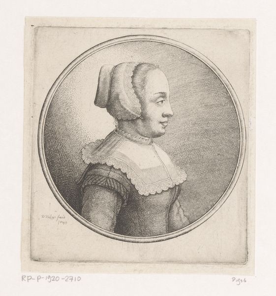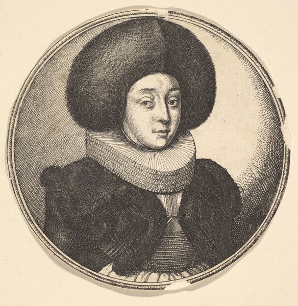 Editor: We’re looking at Wenceslaus Hollar's "Vrouw met stijve plooikraag en grote bontmuts" from 1643, housed in the Rijksmuseum. It's an engraving. Honestly, that collar looks incredibly uncomfortable. What's your take on it? Curator: Oh, but darling, think of it as a statement! This isn’t just some random lady; this is someone announcing her presence. The sheer volume of the fur hat and that ruff, like a pristine, starched halo – it screams status. Hollar was a master of detail; you can practically feel the texture of the fur and the crispness of the linen. Do you get a sense of her personality beneath all that adornment? Editor: I see what you mean about status. Maybe she’s not as uncomfortable as I imagined, just…composed. Is the circular frame significant, or is it just a common choice for portraits of the time? Curator: It's both practical and symbolic, I'd argue. Practically, it focuses our attention, prevents the eye from wandering. But the circle itself… it speaks to completeness, eternity. This isn't just a fleeting image; it's meant to endure, to represent something lasting about this woman and her position. It's like she's encased in amber. Hollar is not just depicting, he's making an assertion, crafting her image, literally. What kind of woman do you imagine she is? Editor: Someone powerful, definitely. And very aware of how she looks. I didn’t expect to get so much from just one portrait! Curator: Isn't it glorious? Hollar manages to distill a whole world into these tiny lines. He gives us a tiny porthole into the past to try and grasp a woman. It leaves you wanting to create your own story about the world she must inhabit, a reflection that's part personal longing. Editor: Absolutely, I’m seeing that now. It's less about the clothing, and more about the character the clothing suggests.