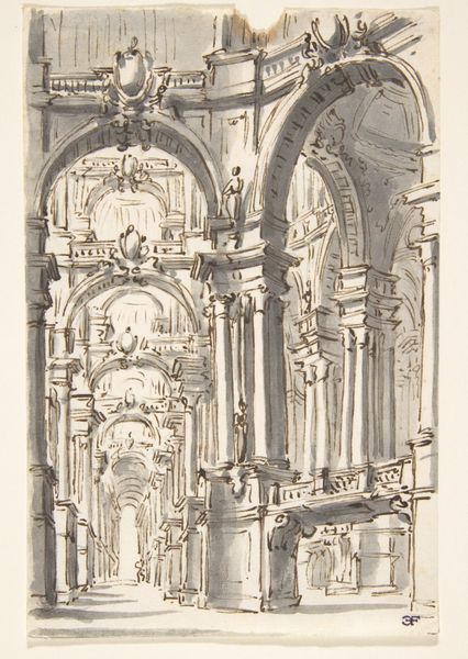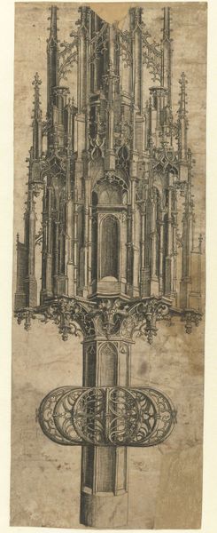Curator: Here we have Samuel Prout’s "Chartres." Prout, who lived from 1783 to 1852, was celebrated for his architectural renderings. Editor: It’s a bit rough, isn’t it? All that graphite on paper. I can almost feel the grit of the stone and the chalky dust. Curator: Precisely. Prout specialized in capturing the texture and grandeur of Gothic structures. Notice how the light emphasizes the immense scale of the cathedral. Editor: Look at those figures huddled at the base. They seem dwarfed, almost consumed, by the sheer volume of material. It speaks to the labor that went into such a place, and the power structures it represents. Curator: Absolutely, and the strategic placing of figures highlights the church's role as both a physical structure and a social hub. Editor: It also raises questions about access, about who these spaces are truly for, and who can afford such extravagant monuments. Curator: Indeed, it offers a lens into the social complexities embedded within even the most revered architectural marvels. Editor: Leaving us to consider whose stories are etched into these stones, and whose were simply paved over.