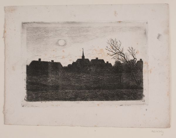 Editor: This etching, "Et gammelt hus" by G.V. Blom, seems to depict a quaint old house in a cityscape. I am intrigued by how detailed it is, especially for what looks like a mass-produced print. What's your take? Curator: What stands out to me is how Blom is employing the traditionally ‘high art’ medium of etching to represent something so commonplace—a regular, old house. He's choosing a subject rooted in the everyday experience of people. Doesn't it make you wonder who might have bought this print, and why they would have chosen to hang this on their wall? Was it about nostalgia, maybe, for simpler times or perhaps about finding beauty in the mundane aspects of modern life? Editor: That's an interesting point! I never thought about how the choice of subject might democratize art, bringing it closer to everyday life. Is there anything special about etching that makes it more 'mass-produced' versus, say, another drawing technique? Curator: Absolutely. Etching, as a printmaking technique, allowed for multiple, near-identical copies. This dramatically altered the consumption of images; they weren't unique items anymore, crafted for an individual patron, but items sold to the masses. Considering the labor involved, this kind of reproducibility shifts the social context in which art is experienced, moving it from exclusive collections to potentially broader social circulation. It speaks volumes about how technologies shape taste. Editor: I never really thought of prints as products, but more as a type of drawing. I now have more understanding of art in everyday life. Curator: It’s about thinking about who is making this, what their working conditions may be, and the means of circulating these prints. Always return to labor, material and their wider economies to better see an artwork in all its dimensions.