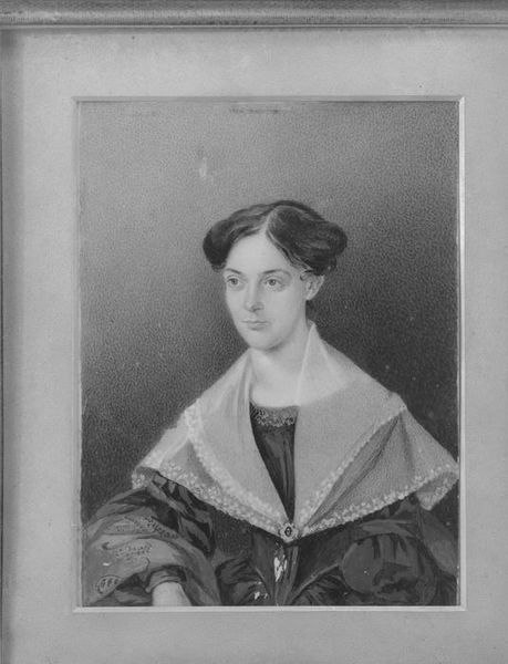 Curator: Here we have a diminutive marvel: François Meuret's pencil drawing, "Portrait of a Woman, Said to Be Marie de Mautesson," likely created between 1825 and 1835. Editor: It feels instantly intimate, almost secretive. That gaze—serene but knowing. She seems to hold her breath, doesn't she? And the detail in that lace collar, a spiderweb of delicacy... Curator: The miniaturist tradition often evokes that feeling of personal connection, as it literally was something held close, almost like jewelry, but also like keeping memory intact in small portable form. It suggests Neoclassical ideals—balance, clear lines, yet softens them into a more Romantic era sensibility. Editor: Absolutely. That towering hairdo is a world in itself—a sculpted landscape! So many implications in those curls! A little empire balanced on her head... There is some hint of severity, despite of the medium softness. And she is also so pale, that she seems like a ghost from another era... I wounder what story is there to find out. Curator: These miniature portraits, even in pencil, functioned as statements, proclaiming both status and personality. Her attire speaks to her social standing, yet that gaze, as you noted, invites a more personal reading, especially with the choice to work only with a pencil on such an art work. The gray scale emphasizes all. Editor: I wonder about the act of creating this portrait. Such intimate encounter with a woman who carries history... The drawing feels like a quiet conversation. The eyes don't stare back at us but into the distance where no one can trespass. She feels guarded and strong. And what I truly appreciate, is how all these historical figures that fill up Museums all around the world, get an eternal life through these amazing portals. Curator: Indeed. It is a portal, connecting us to individual stories, carefully framed by aesthetic and social conventions. Editor: A soft spoken power captured in grayscale, like the gentle echoes of lives lived—whispering across centuries...