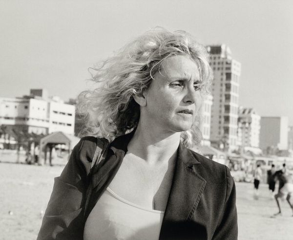 Curator: Today we’re looking at a photograph entitled "Dominique Gonzalez Foerster" by Oliver Mark, created in 2002. The piece captures its subject outdoors, posed against a blurred, yet urban, backdrop. Editor: My initial reaction is of muted tension. There’s something stark and confrontational in her direct gaze, almost challenging. And the cold, green-tinged light emphasizes that feeling. Curator: The gaze is definitely key. In portraiture, it dictates the relationship we have with the subject. Here, it lacks warmth but demands acknowledgement. Do you think that coldness ties to the architectural shapes that box her in the space, almost framing and compressing the space of the picture? Editor: Absolutely. Considering Foerster’s own art, her work deconstructs space and architecture to analyze themes like identity, femininity, or isolation, which makes this portrait particularly resonant. The geometric backdrop, combined with her gaze, reflects that experience. She isn’t merely standing; she’s strategically placed. The question for me then is, where is the subject placed in their personal story through the way that Mark chose to position Foerster against an external frame. Curator: That feels very present, and yes, I think Oliver Mark subtly draws on that iconography. There's also a hint of vulnerability beneath the intensity. Perhaps a suggestion about the nature of exposure in the context of a public role? Editor: Right, this interplay between private persona and public display resonates now in our contemporary landscape saturated with constant exposure. Consider it also in terms of a cultural phenomenon about the power and implications behind photographic representations. We can't detach these photographs of women in any era without a discussion about social power, identity, or visual economy. It opens a Pandora's Box, truly. Curator: Absolutely! I am leaving here seeing this as a quiet assertion about visibility, both imposed and chosen. Thanks for drawing my attention to the tension of that space. Editor: Likewise, I appreciate how we can appreciate Mark's image as a marker of that contemporary gaze of the cultural Other, or a reflection of the same female visual artist Foerster. It certainly expands my understanding of visual narratives!