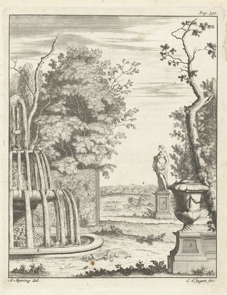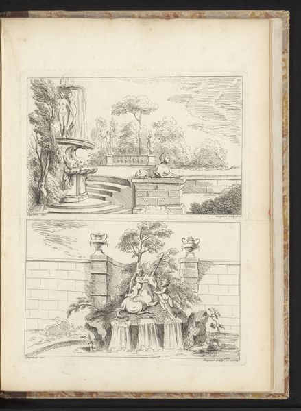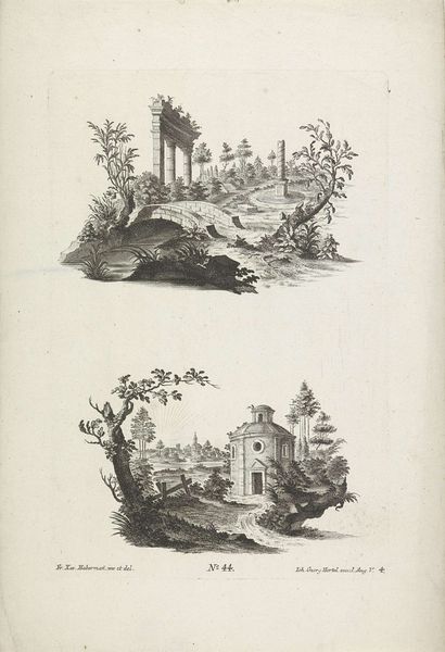 Curator: The line work! So delicate. At first glance, this engraving just whispers refinement. Editor: This is one sheet from Jean Pillement’s Chinoiserie Ornaments, a set of decorative designs, dating from the mid-to-late 18th century, currently residing here at The Met. These engravings helped popularize Chinoiserie designs, and they served as inspiration for artisans crafting everything from furniture to porcelain. Curator: "Ornaments" feels like such an understated description, though. What I see are symbolic worlds within worlds, miniaturized narratives teetering on these almost dreamlike stages. The stylized flora wrapping around each structure, feels almost allegorical. Are we meant to read into these figures, their placement, what do you suppose? Editor: In their time, these vignettes weren't meant to be so deeply interpreted. These images captured the West's fanciful idea of the Orient—a melange of exotic motifs detached from accurate cultural context. The aim was decorative appeal. Curator: Detached yes, but motifs resonate even when extracted. These pavilions, for example. They call back to an idealized past. Architecture as an aspirational structure. Pillement, through engraving, perpetuated symbols of a romanticized and frankly imagined East for Europe, and whether that's informed through anthropology, sociology or orientalism... it impacted us all the same. Editor: That’s right. This is Orientalism distilled for a consumer market—adaptable patterns influencing broader artistic trends in Europe. But do these designs maintain cultural relevance, now that our understanding has evolved? I suppose this print offers an entryway into discussions around cultural appropriation in design. Curator: Absolutely, and perhaps now we can engage with the artwork more reflectively: these stylized forms now serve to represent cultural interaction. How we create narrative, build culture. The act of representation holds as much meaning as what's represented. Editor: Indeed. Pillement’s “Ornaments” become less about accuracy and more about revealing our shifting perceptions over time. Thanks for untangling it all, one symbol at a time! Curator: My pleasure. A journey through lines of meaning.