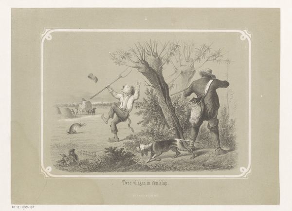 Editor: So, this engraving, "Op hol geslagen paard tijdens de jacht," made sometime between 1842 and 1887 by Carel Christiaan Antony Last… it depicts a chaotic hunt scene. One rider looks incredibly panicked! What stands out to you when you look at this piece? Curator: Immediately, I see a humorous disruption of aristocratic control. The image seizes upon the established symbol of the hunt – a display of wealth, dominance over nature – and cleverly undermines it. Look at how the frantic rider has lost his hat; his face a mask of terror. Doesn't that strike you as a bit of a caricature? Editor: It definitely feels like a pointed commentary, though I wasn't sure what to make of it. Do you think the artist is mocking the upper class here? Curator: I believe it’s a more nuanced critique. The hunt itself becomes a stage for the unexpected. Consider the hat, cast adrift, becoming a potent emblem of lost authority. What did hats symbolize back then? Think about class, status... what happens when that is upended? The viewer becomes complicit, amused by the momentary disruption of order, a chink in the armor of societal expectations. This resonates with the long-standing artistic tradition of poking fun at the powerful. Editor: That makes perfect sense. I hadn’t thought about the hat in that symbolic way. It’s like a visual punchline. Curator: Precisely. It also serves as a trigger for recognition. How many viewers, seeing that, remember similar mishaps, whether personal or observed? Laughter becomes a shared, democratizing experience. Editor: I'll never look at a hunting scene the same way again. Thanks for opening my eyes to the deeper meaning behind those seemingly simple images. Curator: My pleasure. It's rewarding to help unravel the threads of meaning woven into these works. They hold so much more than initially meets the eye.