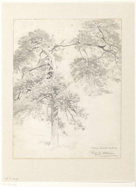 Curator: Let's turn our attention to this fascinating drawing from 1884 by Johan Michaël Schmidt Crans, titled "Spotprent over de politieke problemen," or "Cartoon about the political problems." Editor: My first impression is one of decay and fragility. The spindly tree seems almost skeletal, stripped bare by some unseen force. Curator: Indeed. What immediately grabs me is the stark materiality of the ink on paper, and the way Crans uses these simple means to create a complex commentary. Look closely; he’s meticulously inscribed various financial institutions and political entities onto each branch, labeling the failing colonial banks and industries. Editor: It clearly speaks to a period of upheaval, where financial and political anxieties are quite literally "weighing down" the tree. Consider the title – it signals directly to the socio-political quagmire, and coupled with Heine’s quote which speaks of wind stripping the leaves in a dreary November, creates a powerful metaphor for loss and instability. Curator: Precisely! Notice the almost chaotic linework that comprises the canopy—it really adds to the feeling of a world spinning out of control. And yet, there’s something methodical in how he breaks down each aspect of what constitutes that crisis. This highlights the labor involved in making visible something otherwise obscure. Editor: Absolutely. We also have to consider the visual vocabulary of caricature itself as a potent form of political resistance. It’s about amplifying anxieties but also sparking critical engagement with dominant structures of power. This is where artistic choices reflect deeply entrenched socioeconomic divides that are often underrepresented within historical discourse. Curator: Right. The cartoon, a print accessible to a wider audience, facilitated immediate engagement with critical commentary outside academic spheres. Editor: Seeing how Crans depicted late 19th-century Holland really makes you reflect on present-day parallels with corporatism and political unrest… and reminds us of the continuing value of art as an incisive means of critique and awareness. Curator: Indeed, whether you approach it as an example of the means by which such critical engagement with power is materialised, or simply as a raw visualisation of turbulent times, Crans’ drawing really embodies that sentiment in poignant form.