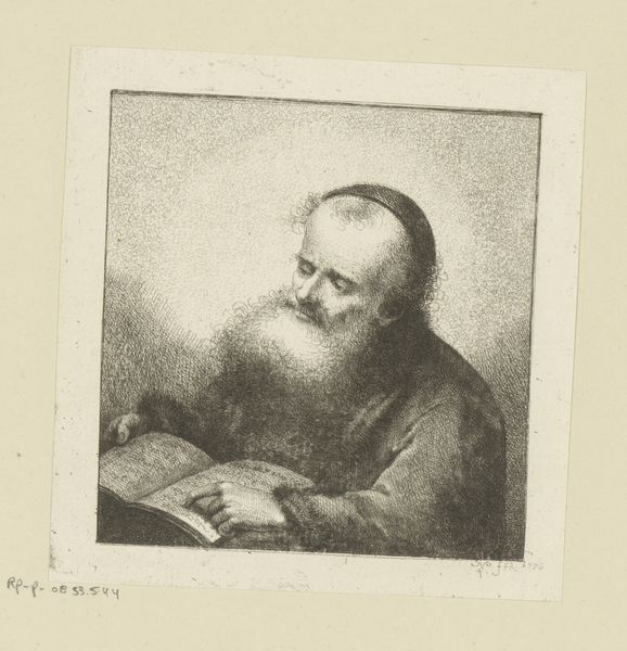 Cornelis Troost created this print of an old man with a beard at an unknown date using etching. The image depicts an elderly man engrossed in reading, bathed in a soft light that highlights his aged features. In the Dutch Republic during the 17th and 18th centuries, literacy and access to books were gradually increasing among the middle class, reflecting a broader societal shift towards education and intellectual pursuits. Troost's choice to depict an old man reading may be interpreted as a commentary on the value of knowledge and wisdom acquired through experience. This work may reflect the cultural values of the Dutch Golden Age, which emphasized learning, reflection, and personal enlightenment. Art historians use a variety of resources, including period documents, literary sources, and studies of artistic conventions, to interpret the meanings embedded in images like this one. The meaning of art is contingent on social and institutional contexts.