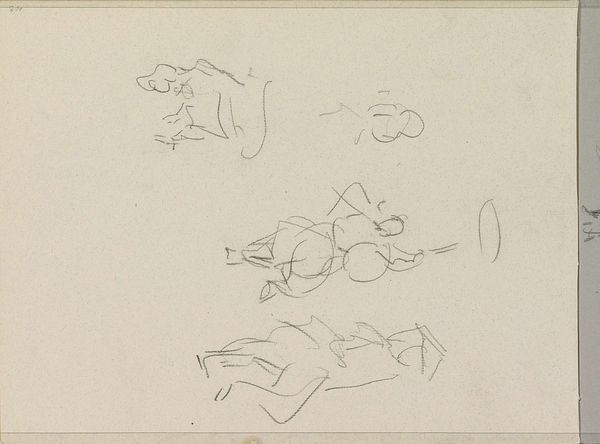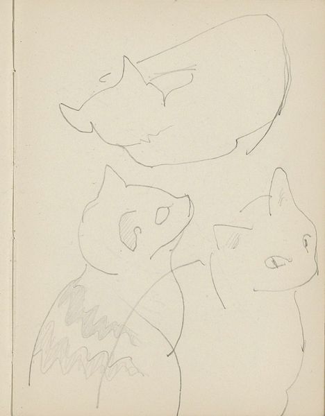 Editor: So, this is *Katten*, or "Cats," by George Hendrik Breitner, dating from around 1885 to 1898. It’s a graphite and pencil drawing. It’s charming in its simplicity, but I am intrigued by its sketch-like quality. What does this tell us? What do you make of it? Curator: Precisely, that “sketch-like quality” provides insight into artistic practices and the institutional structures that validate certain kinds of art. We are seeing Breitner's private exploration, a glimpse into his working methods, perhaps never intended for public consumption. Editor: So this challenges traditional notions of “finished” artwork? Curator: Exactly! In the late 19th century, the rise of Impressionism was disrupting established academic artistic norms. But an informal sketch like this further complicates our understanding. It invites us to consider what role did the art market have on art making in Amsterdam at that time? Why was it eventually deemed worthy of display? Editor: It does make me think about access, who gets to see art, and who decides what’s important. Was Breitner critiquing something with this drawing, or do you think it might have simply been him just experimenting for himself? Curator: Breitner, known for capturing Amsterdam's street life, was certainly conscious of portraying the "everyday." But the later presentation of pieces such as *Katten* allows the modern audience to appreciate this, providing an insight into the artistic process, questioning traditional ideas about artistic skill and intention. Ultimately expanding our idea of what “art” could even mean. Editor: It's interesting to consider this drawing not just as a sketch but as a historical artifact reflecting shifting cultural values. Thanks, this perspective has changed my view on *Katten.* Curator: Likewise. I find it thought-provoking to trace how pieces initially created outside formal institutions enter museum collections and reshape our understanding of art history.
