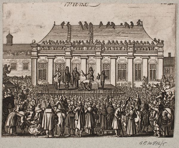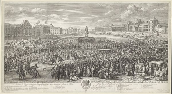 Editor: We're looking at a drawing, probably in ink on paper, by Adolf van der Laan. It's called "Entry of Emperor Charles VI into Prague and the two young Archduchesses on July 30, 1723." The overall effect is pretty grand, but also quite detailed in a way that's engaging. What do you see in this piece? Curator: What strikes me immediately is the performative nature of power that’s on full display here. Van der Laan is not simply documenting an event; he's meticulously constructing an image of imperial authority. Consider the architectural backdrop. It dwarfs the commoners while framing the procession. How does that spatial relationship strike you? Editor: It definitely creates a sense of hierarchy, a very clear distinction between the rulers and the ruled. It’s interesting how the people seem almost like spectators in a play. Curator: Exactly! Think about it in terms of spectatorship and access. Who has the privilege to witness this spectacle up close? And who are relegated to watching from windows or the fringes? The artist uses light and shadow to emphasize some figures while obscuring others, contributing to this visual hierarchy. Does that not also speak to the social realities of the time? Editor: Absolutely, I see how it highlights the existing social inequalities, how power is visually reinforced not just by who's present, but where they are positioned within the space. Curator: Precisely! By examining this drawing, we gain insights into the power dynamics and constructed image of imperial rule prevalent in the early 18th century, prompting us to question the ways in which such displays of power continue to manifest in contemporary society. I found it thought-provoking! Editor: I completely agree. I’m going to rethink a few things, so I learned something new today!