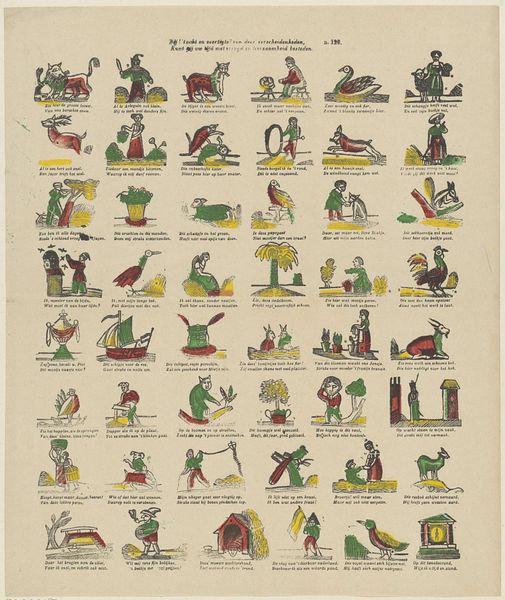 This teaching print, made by Lutkie & Cranenburg, presents an array of forty-eight images designed for the education of children. At first glance, one might see simple illustrations, but let us delve into the symbolic richness embedded within. Consider the image of the anchor. Throughout history, the anchor has been a symbol of hope and steadfastness, a representation of stability in turbulent times. We see echoes of this in ancient Mediterranean art, where anchors symbolized security, and later in Christian iconography, representing hope in times of adversity. Yet, in this print, amidst images of everyday objects and scenes, the anchor's presence evokes a deeper, perhaps subconscious, recognition of humanity's constant quest for stability. It reminds us that the symbols we use to teach the young are not merely instructive, but also carriers of cultural memory, shaping our emotional and psychological landscapes in ways we may not fully grasp. Symbols such as these recur through time, a testament to our collective, evolving consciousness.