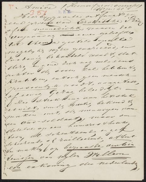 Curator: So, we have here "Brief aan onbekend", or "Letter to an Unknown" by Abraham Krayestein, possibly from 1815, rendered in pen and ink. What strikes you most about it? Editor: It's hard to immediately connect with it. It’s basically a handwritten letter and so difficult to read… It's kind of a monochromatic mess of cursive and antiquated spelling. I struggle to even grasp what the context might be. What is your interpretation of it? Curator: Indeed. Think of the socio-political environment of 1815. Europe is in flux, just after the Napoleonic Wars. Personal correspondence becomes crucial. Now, observe the elegance in the penmanship. Note how the flourishes almost become decorative elements, blurring the lines between functional text and artistry. Considering Romanticism's focus on emotion and individualism, what kind of person do you imagine writing this letter, and under what circumstances? Editor: Possibly someone quite educated, writing to someone of status, based on the style? The text does feel… important, perhaps formal in a way that personal letters are no longer. Do you think it reflects anything about the social structures of the time? Curator: Absolutely. Consider the societal constraints of the early 19th century, the rigid class structures and importance of social standing, and now read this work. It's a fascinating glimpse into the mindset of the period. The "unknown" addressee could represent a desire for connection beyond those prescribed societal boundaries. It is really interesting how social mores create different forms of artistic expression. Editor: It's fascinating how something as simple as a letter can reflect so much of its time. Curator: Indeed. Art unveils our past. Thank you for this analysis.