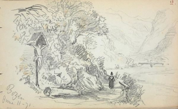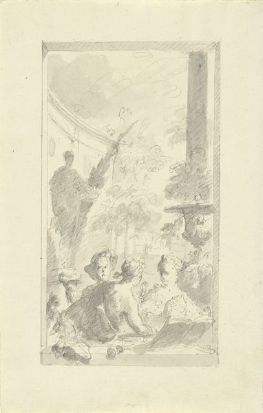 Editor: Here we have Dionys van Nijmegen's 1756 piece, "Ontwerp voor een zaalstuk: twee vrouwen voor een landschap," rendered in pencil and drawing. The Rococo style gives it a light, airy feel, almost dreamlike. I'm curious, what catches your eye about this piece? Curator: Immediately, the process behind this work as a "zaalstuk," or salon piece, interests me. This wasn't created in a vacuum; it was intended to adorn a domestic interior, influencing the lives, labor, and consumption patterns of those who occupied the space. What can you discern about the materials and techniques employed here? Editor: I notice the varied use of the pencil, creating light and shadow, and it looks like there is a sort of ink wash. What does this imply for its intended audience? Was this the average patron, or did it target an upper class? Curator: Precisely. Consider the labour invested in materials. Pencils weren't mass-produced. The paper, ink and level of draughtsmanship would have only been available to a segment of society, who often sought to emulate the aristocratic lifestyle. Does the sketch itself seem preparatory to you, hinting at a larger commission? Editor: Yes, you're right. It does have that initial study feel to it. Perhaps it reveals something about the commodification of leisure during the Rococo period – the idealized landscape serving as a backdrop for privileged pastimes. It really reframes how I view it! Curator: Indeed. By looking at this 'simple' sketch, we have actually unpacked layers of historical production, socioeconomic stratification and material ambition tied into this work. What will you take away from this discussion? Editor: I'll definitely be thinking more about how material constraints can actually inform our understanding of an artwork's broader cultural impact and legacy, moving forward. Thank you!