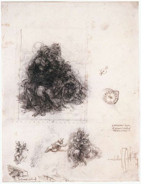 Editor: This is Leonardo da Vinci’s "Study of battles on horseback and on foot," made in 1504 using pen, ink and pencil on paper. The furious energy in the lines makes me feel overwhelmed, almost like I'm on the battlefield myself. What strikes you most about the composition? Curator: The formal arrangement is quite striking, wouldn't you agree? Notice how Da Vinci uses line to create movement. The frenetic quality you mentioned arises, in part, from the sheer density of lines. What do you make of the overall structure of these chaotic lines? Editor: Well, it feels top-heavy, with that dense cluster of figures at the top seeming to overwhelm the looser sketches below. Curator: Precisely. Observe how the heavier, more detailed rendering at the top serves as a focal point, a condensed expression of conflict, contrasting with the relatively sparse treatment below. This juxtaposition highlights a formal tension, does it not? Editor: So it's not just a chaotic mess, but a deliberate play with density and emptiness? The blank spaces draw your eye to the more frantic lines. Curator: Exactly. Da Vinci uses negative space as an active element. The lines themselves aren't just descriptive, but formally structural, defining not only the figures but the dynamic relationships between them and the void. Have you noticed anything else noteworthy about these lines? Editor: Now that you mention the lines, it seems they almost have a life of their own. They definitely communicate energy. It’s all about motion and dynamism. Thank you! Curator: Indeed. It's a remarkable display of line as both representation and formal device. A study in pure movement and force. Thank you for your perspicacity.