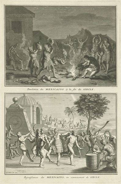 Bernard Picart made this print, "Indian Funeral Rituals," using etching and engraving techniques. These processes involve using sharp tools to incise lines into a metal plate, which is then inked and printed. The stark contrast of black ink on paper creates a powerful image, typical of printmaking's graphic language. Here, the material properties of the print—its reproducibility and portability—are crucial. Prints like this one circulated widely in the 18th century, disseminating information and shaping European perceptions of other cultures. Consider the labor involved: the meticulous work of the engraver and the press operator contrasts sharply with the depicted scenes of ritual suicide. Picart's print, while presented as documentary, is also an act of interpretation, filtered through the lens of European sensibilities and, of course, rendered for a European market. It shows us how the means of production can both inform and distort our understanding of cultural practices.