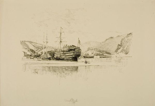 Editor: This is Joseph Pennell's "Teignmouth Bridge." It’s a delicate drawing, almost ghostly, with these tall ships mirrored in the water. What strikes you about the composition? Curator: The composition exhibits a clear dialogue between line and void. Consider how the skeletal structures of the ships are echoed in the bridge's linear span. How do these formal echoes affect your reading of the image? Editor: It makes the bridge seem like a natural extension of the ships, or vice versa. Curator: Precisely. The artist employs a visual language that interweaves the mechanical with the organic, leading us to consider the semiotics of industrial development in relation to natural forms. Editor: I never considered the shapes that way. Thanks! Curator: Indeed, visual analysis enables a richer understanding.